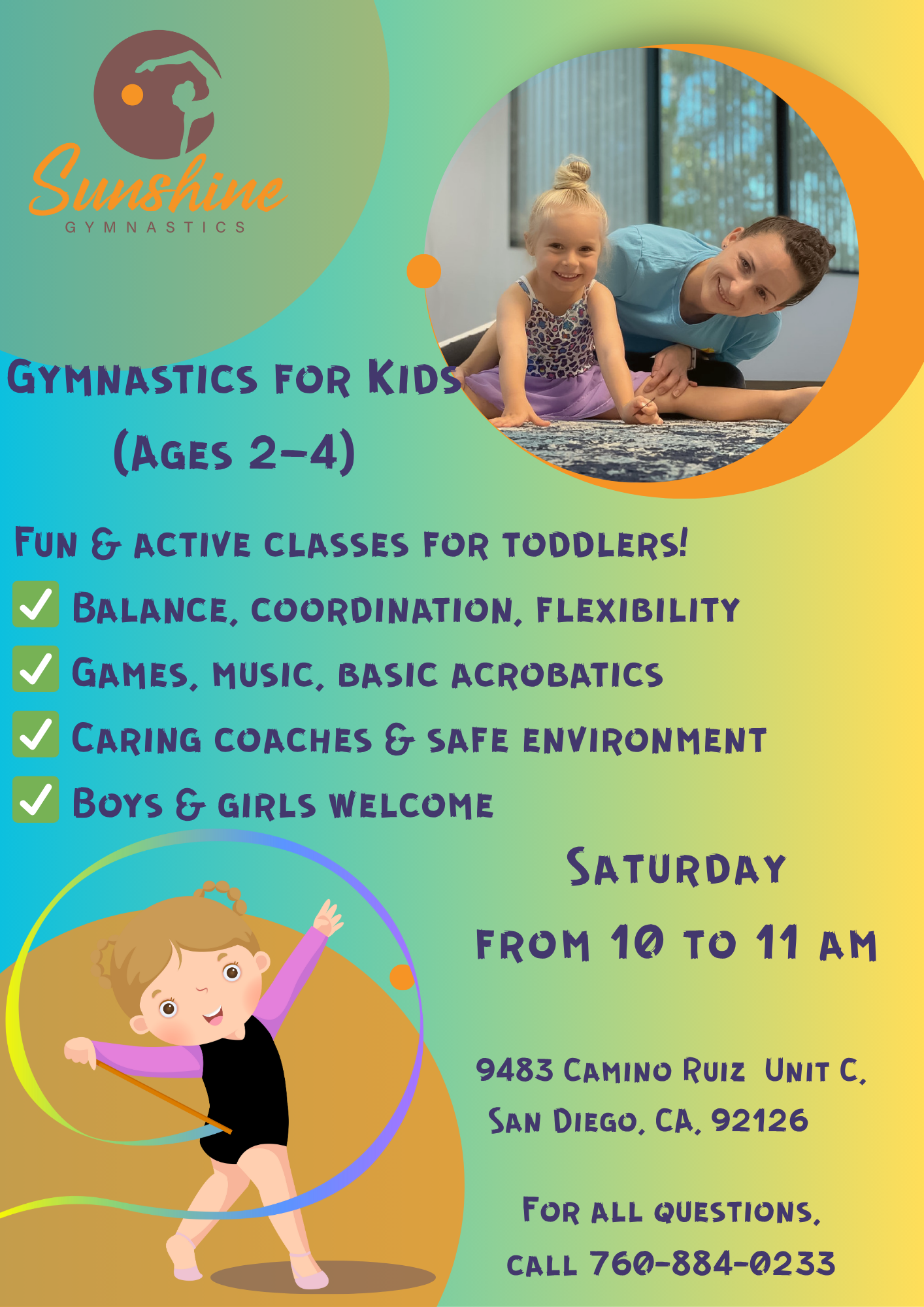 For competitive team Level 3-5+ / Xcel Program and private classes prices, please contactalinasunshinerg@gmail.com